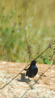 A male Indian robin hopped around about 10 feet away picking off insects from a rock. He kept an eye on us as we circled him with our cameras. Infuriatingly, he managed to keep a little vegetation between him and our cameras before he flew off. Farther away on an electric wire, a male pied bushchat sat, quite unconcerned by the rash of clicking cameras that focused on him.